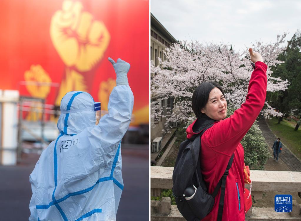 拼版照片:左圖為2020年2月12日,安徽援鄂醫療隊隊員周?chē)t在武漢體育中心方艙醫院前豎起拇指為自己和同伴加油;右圖為2021年3月13日,周?chē)t參加武漢大學(xué)援鄂抗疫醫護人員賞櫻專(zhuān)場(chǎng),在櫻花樹(shù)前拍照留念。