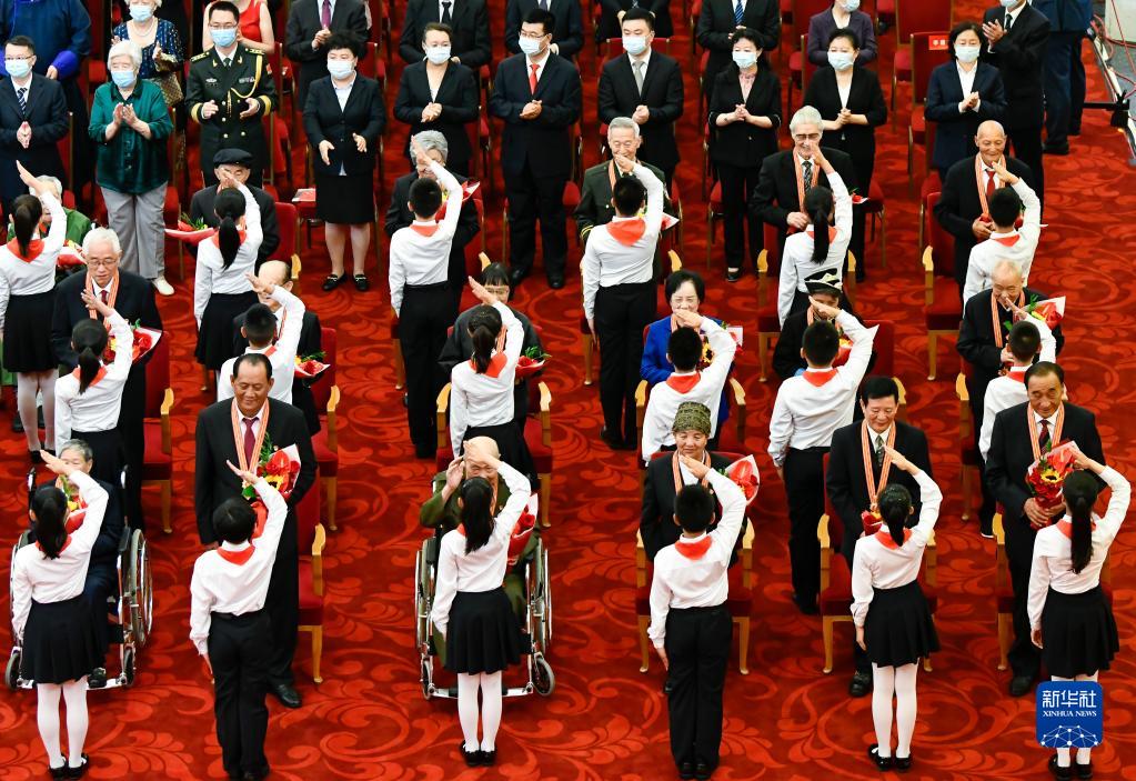 2021年6月29日,慶祝中國共產(chǎn)黨成立100周年“七一勛章”頒授儀式在北京人民大會(huì )堂金色大廳隆重舉行。這是少先隊員向“七一勛章”獲得者獻花,敬禮致意。