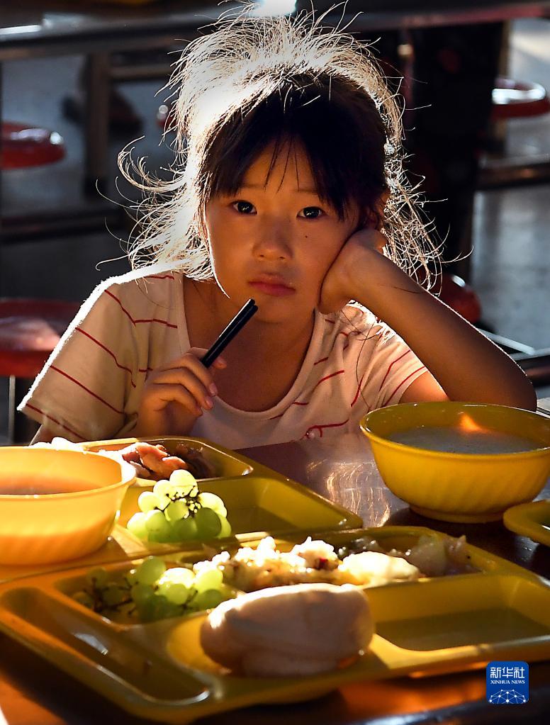 2021年7月29日,一名小朋友在河南省鶴壁市??h黎陽(yáng)中學(xué)長(cháng)豐校區安置點(diǎn)內吃晚飯。
