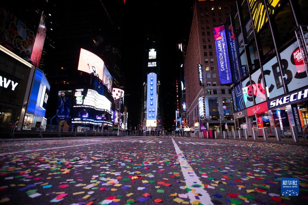 2021年1月1日凌晨,美國紐約時(shí)報廣場(chǎng)空空蕩蕩。受新冠疫情影響,2021年時(shí)報廣場(chǎng)跨年慶?;顒?dòng)不對普通觀(guān)眾開(kāi)放,只通過(guò)電視和線(xiàn)上轉播,以避免人群聚集。