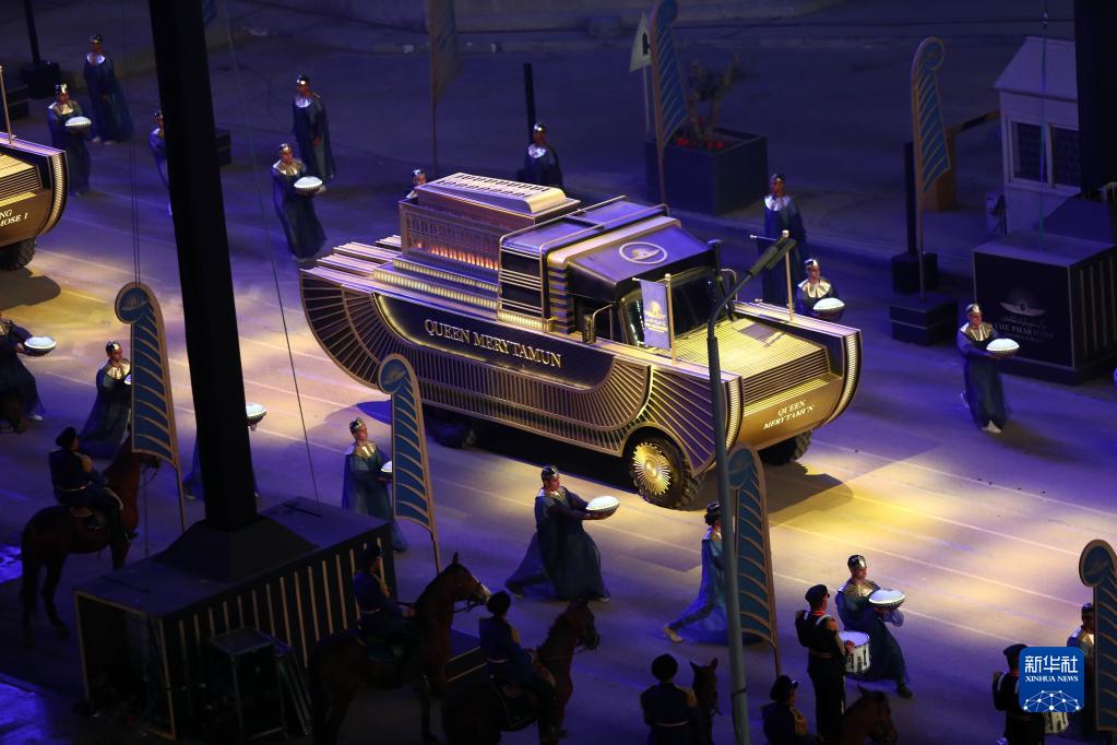 2021年4月3日晚,在埃及首都開(kāi)羅,金色定制花車(chē)運送轉移木乃伊。當晚,收藏于埃及國家博物館的22具古埃及法老和王后的木乃伊被轉移至埃及文明博物館,以打造新的旅游熱點(diǎn)。