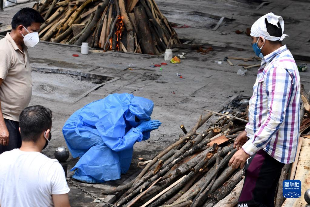 2021年5月21日,在印度首都新德里一家火葬場(chǎng),逝者親屬身著(zhù)防護服在火化前哀悼因新冠去世的親人。