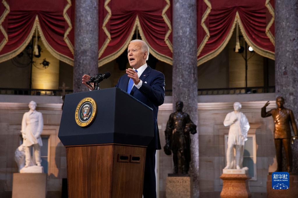 1月6日,美國總統拜登在華盛頓國會(huì )大廈發(fā)表講話(huà),紀念國會(huì )山騷亂事件一周年。