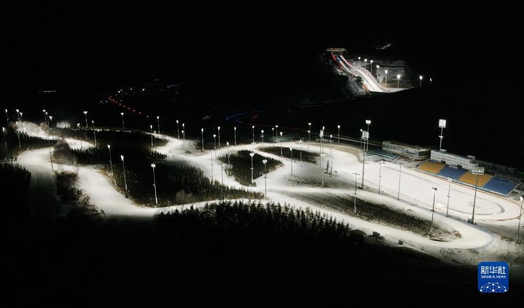 這是張家口賽區國家越野滑雪中心(下)與國家跳臺滑雪中心(上)夜景(2021年2月30日無(wú)人機照片)。
