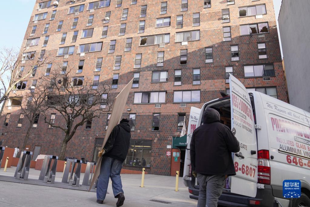 1月10日,工作人員在美國紐約市布朗克斯區發(fā)生火災的公寓樓外搬運木板。