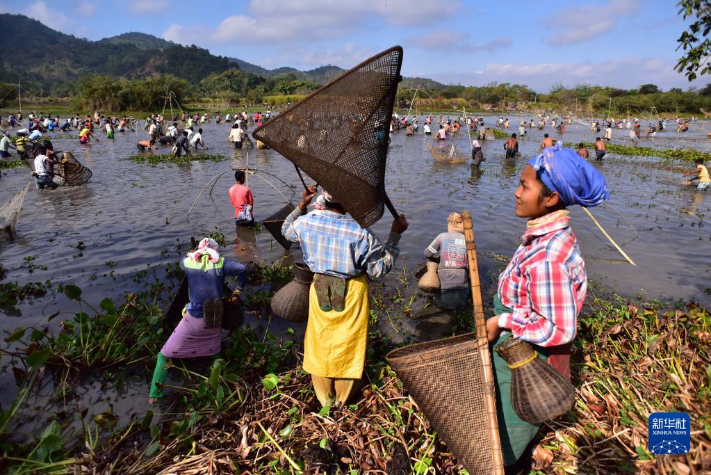 1月13日,在印度阿薩姆邦高哈蒂一處村莊,當地村民參加捕魚(yú)活動(dòng),慶祝收獲季的結束。新華社發(fā)