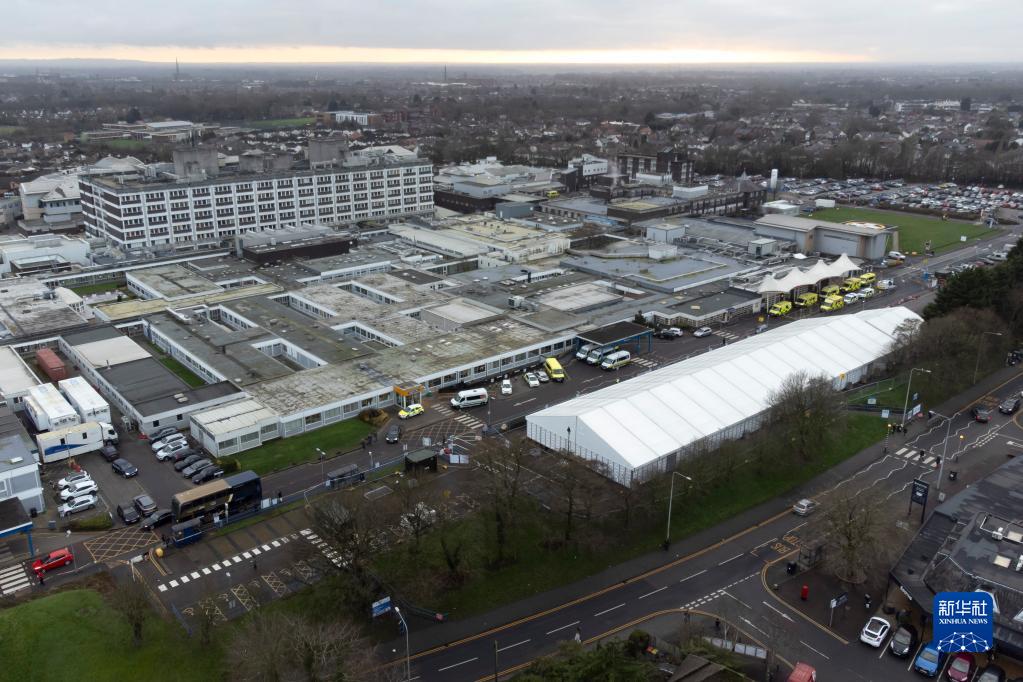 這是1月13日在英國普雷斯頓拍攝的一家正在建設中的臨時(shí)醫院(無(wú)人機照片)。
