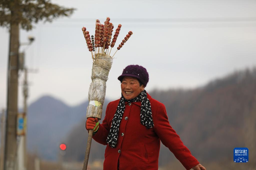 1月15日,在遼寧省鳳城市石城站,一位農民帶著(zhù)自制的糖葫蘆準備上車(chē)。