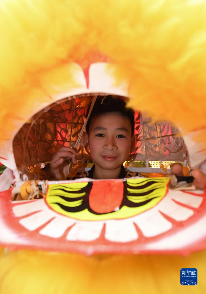 1月20日,在前童古鎮,13歲的“少年獅王”張鎮浩在練習間隙留影。