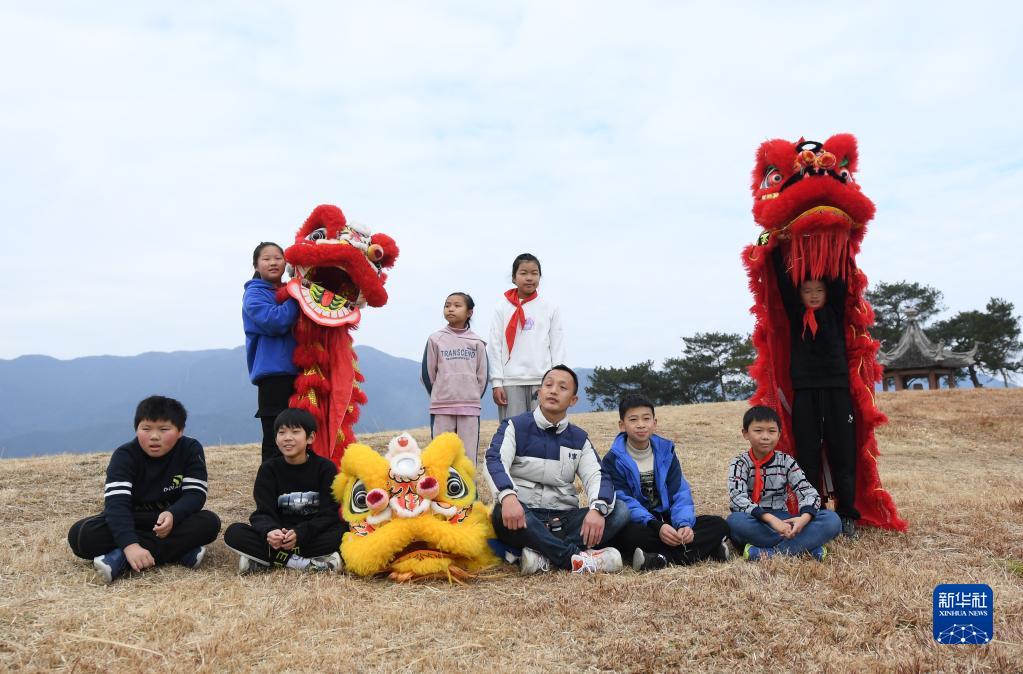 1月21日,童攀峰(前中)和部分舞獅隊成員在前童古鎮邊的小山上合影。