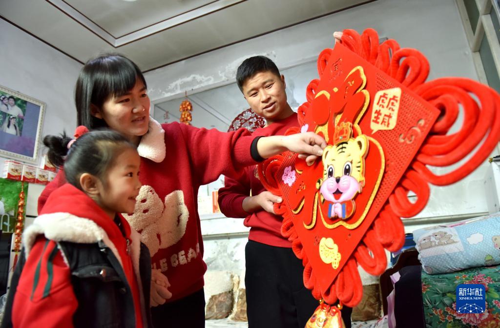 1月31日,在邢臺市南和區賈宋鎮北楊莊村,宋建飛和家人一起布置春節飾品。