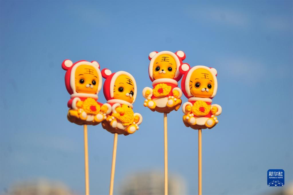 這是湖北省宜昌市夷陵區民間藝人在一場(chǎng)文化展示活動(dòng)中展示的面塑飾品“幸福吉祥虎”(2021年12月30日攝)。