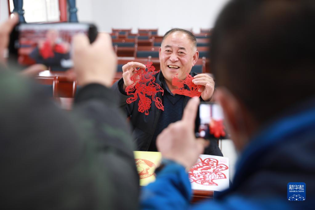 在蘭州市七里河區西果園鎮袁家灣村村民活動(dòng)中心,村民袁正春展示自己剪的窗花(1月26日攝)。