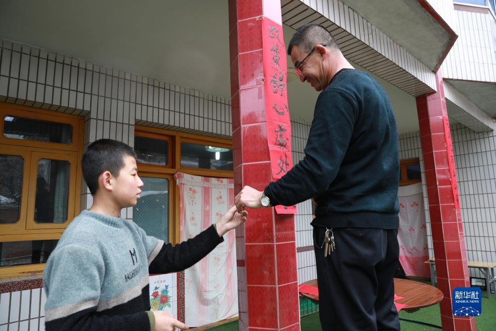 在蘭州市七里河區西果園鎮袁家灣村,村民馬明禎(右)和兒子在家中一起貼春聯(lián)(1月26日攝)。