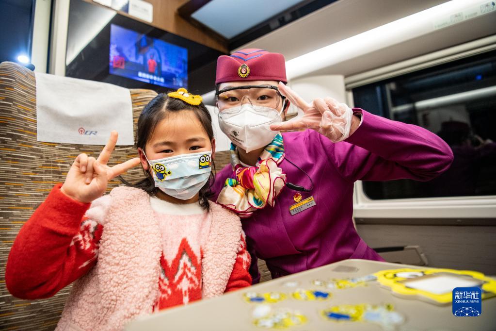 林夢(mèng)凡(右)在成渝高鐵智能復興號“共青團號”列車(chē)上和小朋友合影(1月27日攝)。