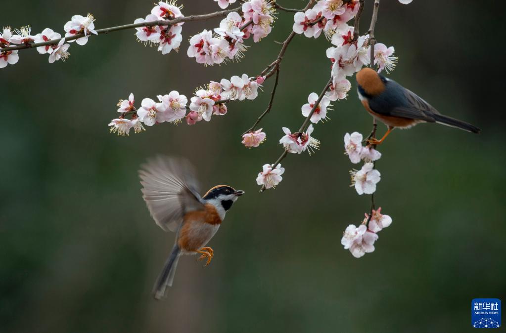 2月4日,在江蘇省無(wú)錫市管社山莊,小鳥(niǎo)在花間嬉戲。