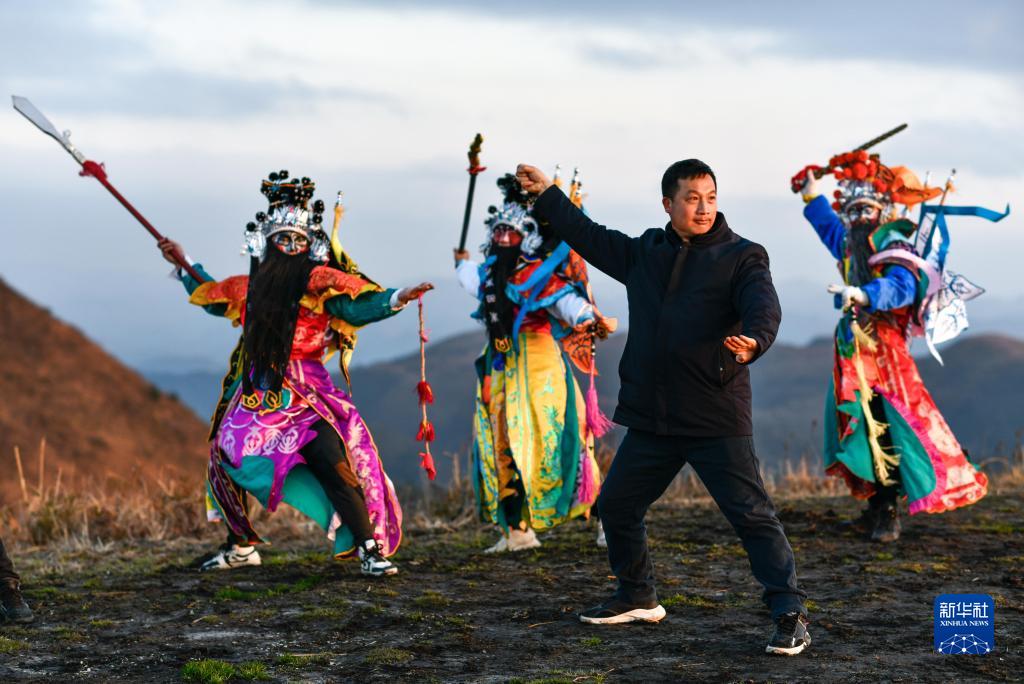 2月7日,龍里太平花燈戲藝人劉江(前)在村子附近的山頂上指導年輕人練習花燈戲。