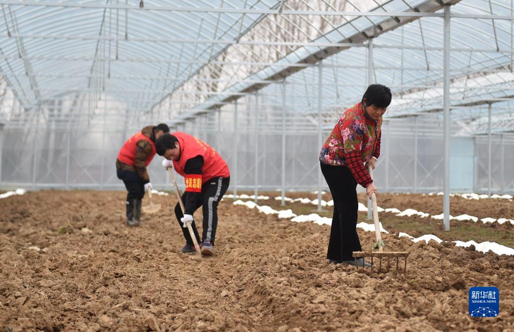 2月11日,在安徽省合肥市廬陽(yáng)區大楊鎮十張村一農業(yè)大棚,黨員志愿者幫助農民進(jìn)行西瓜地開(kāi)溝起壟。