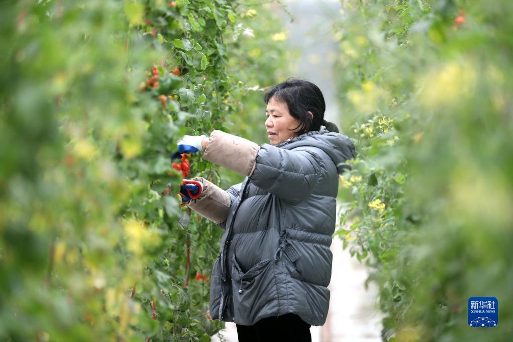 2月11日,浙江省東陽(yáng)市南馬鎮花園村現代農業(yè)生態(tài)園員工在采摘水果番茄供應市場(chǎng)。