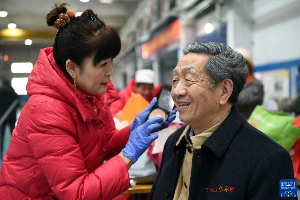 2月13日,在河北電機股份有限公司生產(chǎn)車(chē)間,石家莊市欒城區樓底農民工俱樂(lè )部成員在為李俊岐(右)化妝。