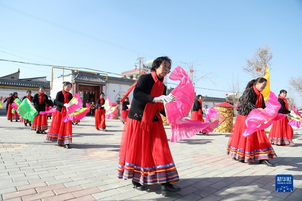 2月15日,甘肅省臨夏縣土橋鎮辛付村村民跳起舞蹈過(guò)元宵。