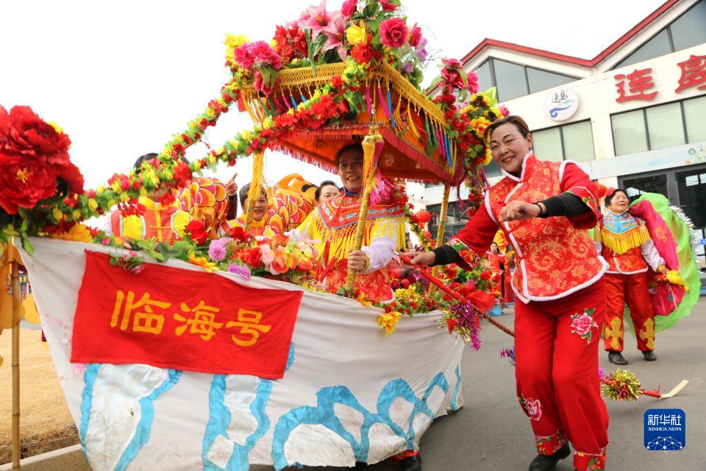 2月15日,民間藝人在江蘇省連云港市連云區連島漁村表演“劃旱船”。