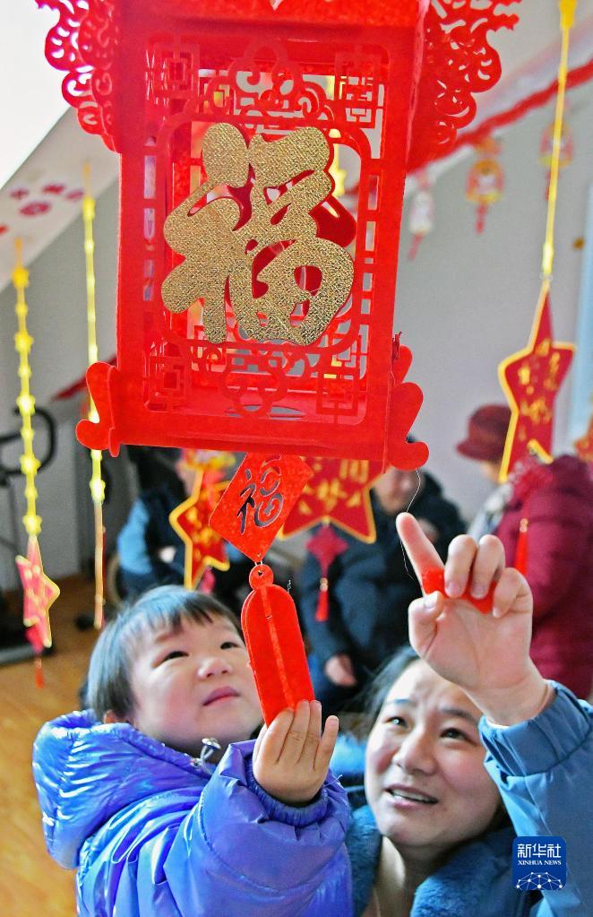 2月15日,小朋友在山東省煙臺市福山區富祥社區“歡樂(lè )鬧元宵”活動(dòng)中猜燈謎。