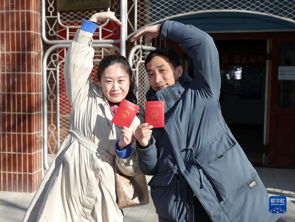 2月22日,在衡水市桃城區民政局婚姻登記處,新人展示剛剛領(lǐng)取到的結婚證。