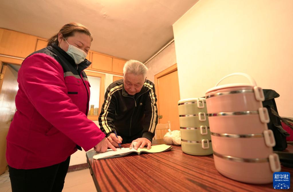 河北省邢臺市康寧智慧居家養老服務(wù)中心工作人員(左)把午餐送到檀成海老人家中(1月6日攝)。