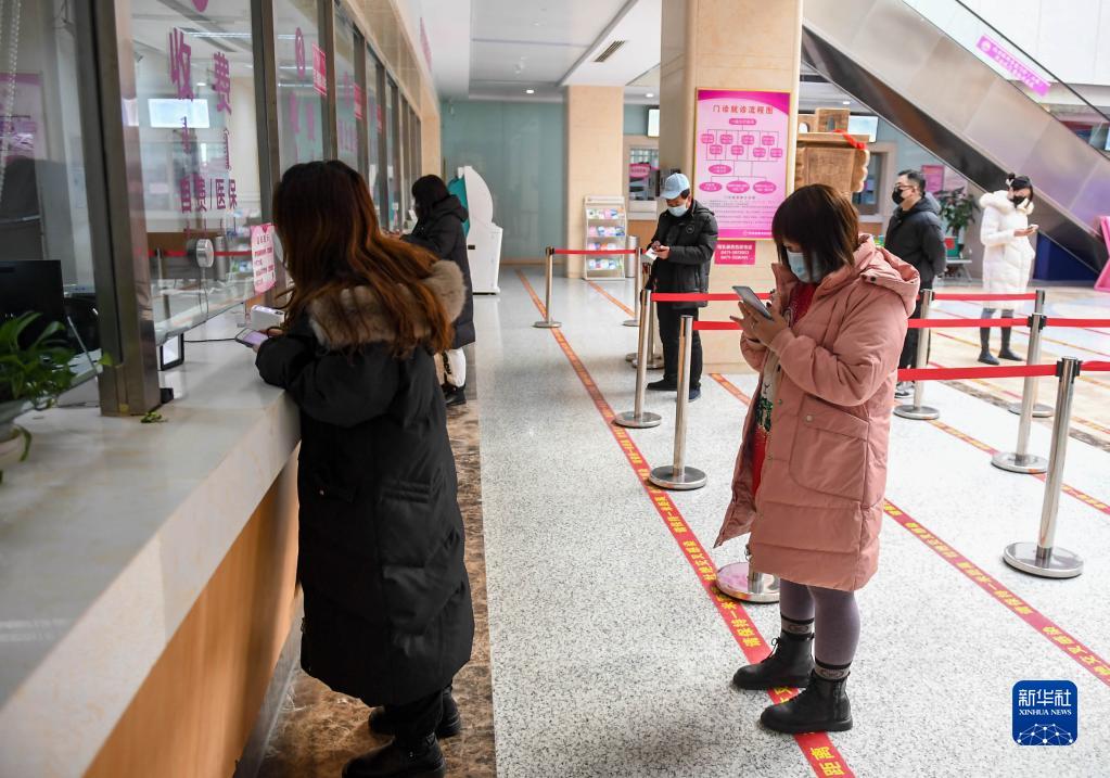 2月23日,在呼和浩特市婦幼保健院門(mén)診樓內,就診人員在一米線(xiàn)外排隊等候。