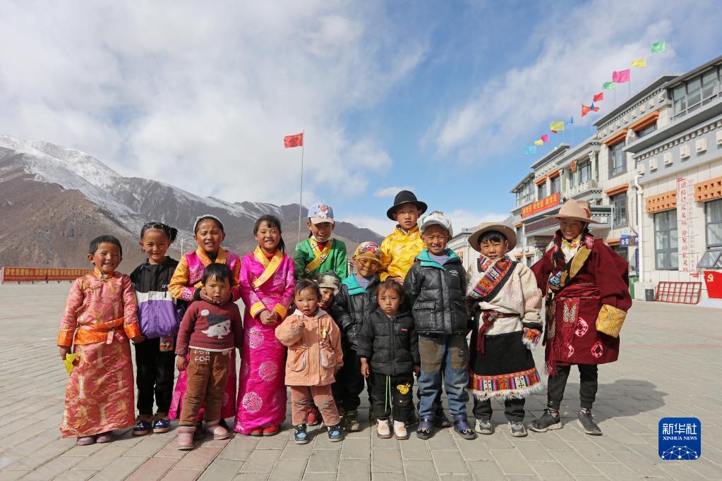 部分搬遷牧民家的孩子在搬遷點(diǎn)廣場(chǎng)上合影,他們當中大一點(diǎn)的出生在榮瑪,最小的幾個(gè)出生在古榮(2月28日攝)。