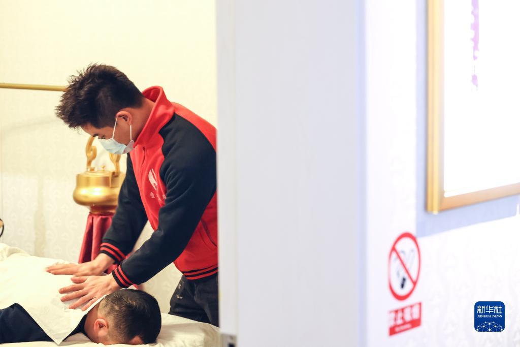 3月1日,“折耳根”樂(lè )隊鼓手陳昌海在推拿店內給客人推拿。