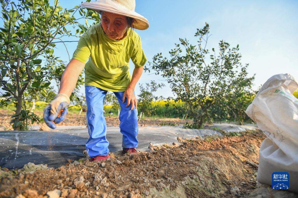 在常德市石門(mén)縣葉家坪村,葉金娥在田間施肥(3月15日攝)。