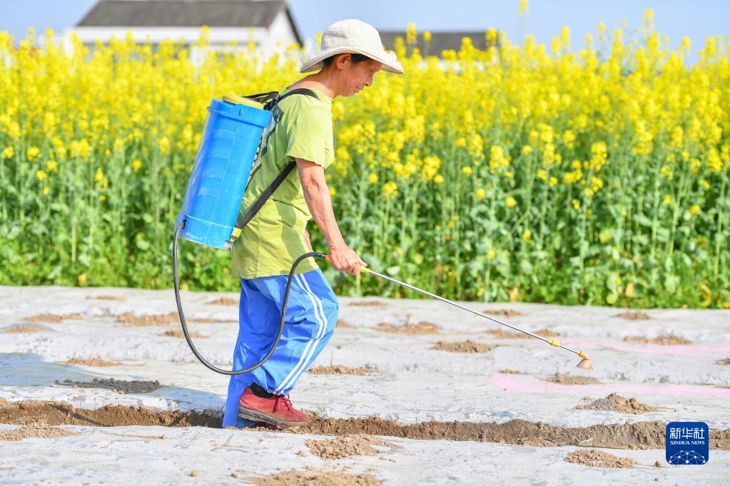 在常德市石門(mén)縣葉家坪村,葉金娥在田間噴灑農藥(3月15日攝)。