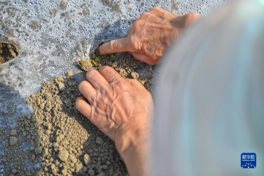在常德市石門(mén)縣葉家坪村,葉金娥在查看農作物生長(cháng)情況(3月15日攝)。