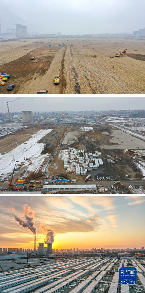 拼版照片:上圖為3月13日拍攝的吉林市高新南區隔離方艙建設現場(chǎng)(無(wú)人機照片);中圖為3月15日拍攝的吉林市高新南區隔離方艙建設現場(chǎng)(無(wú)人機照片);下圖為3月20日拍攝的吉林市高新南區隔離方艙建設現場(chǎng)(無(wú)人機照片)。