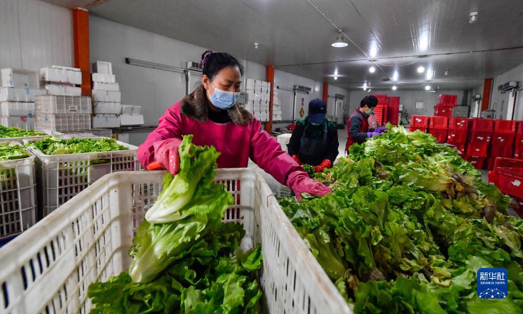 3月21日,在誠好(天津)供應鏈管理有限公司車(chē)間,工人將水培蔬菜去除根系后裝箱。新華社記者 孫凡越 攝