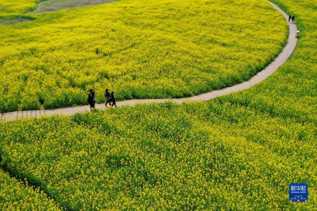 3月8日,游客在重慶市大足區中央城市花海公園的油菜花田游玩,該片油菜花田均為“慶油系列”油菜品種(無(wú)人機照片)。