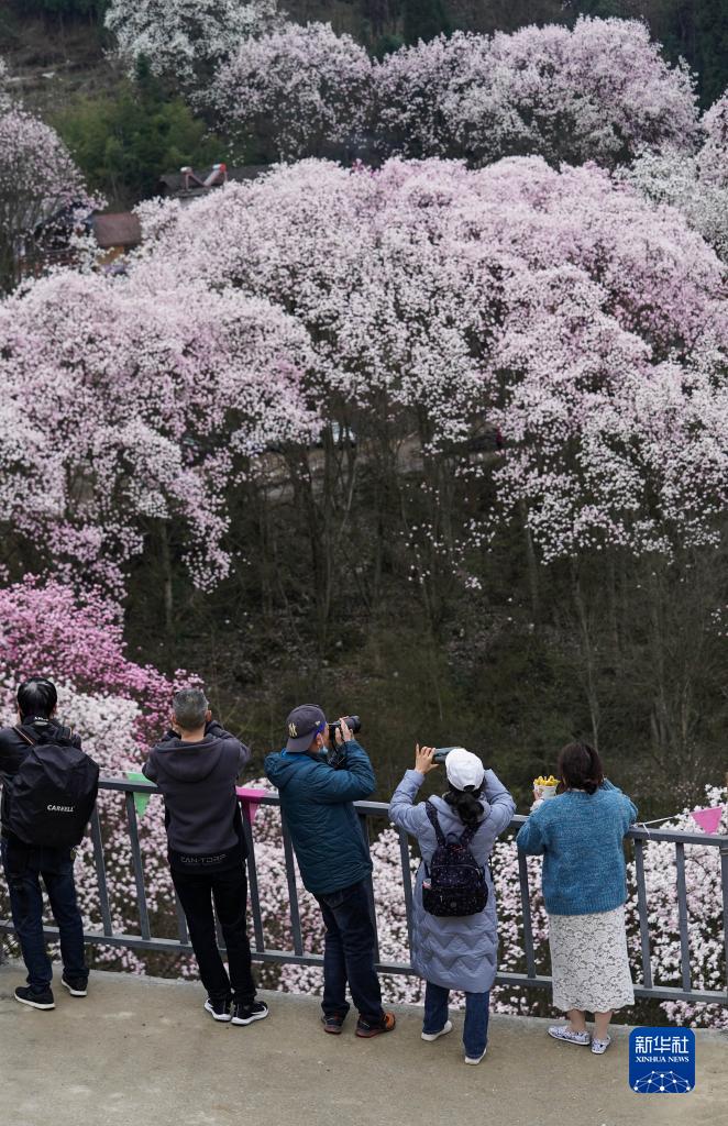 3月22日,幾名游客在江油市大康鎮戴天山村觀(guān)賞拍攝辛夷花。