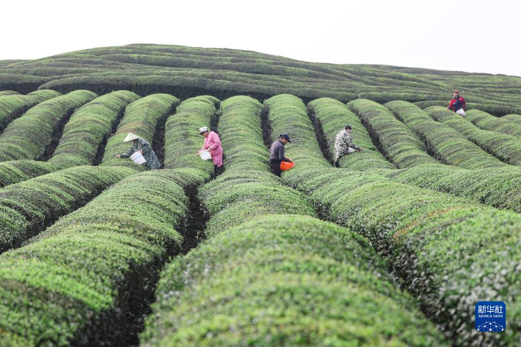 3月24日,在江西省宜春市上高縣新界埠鎮一茶場(chǎng),村民采摘明前茶。