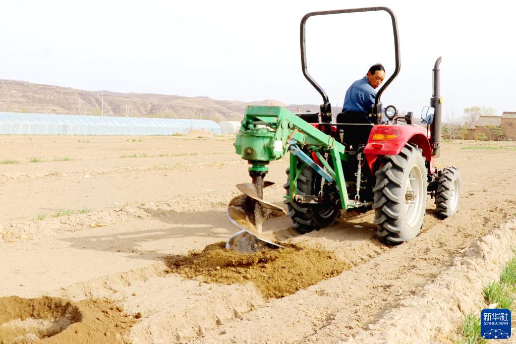 3月26日,甘肅省平?jīng)鍪徐o寧縣城川鎮大寨村村民用拖拉機打育樹(shù)坑,準備新植果樹(shù)。