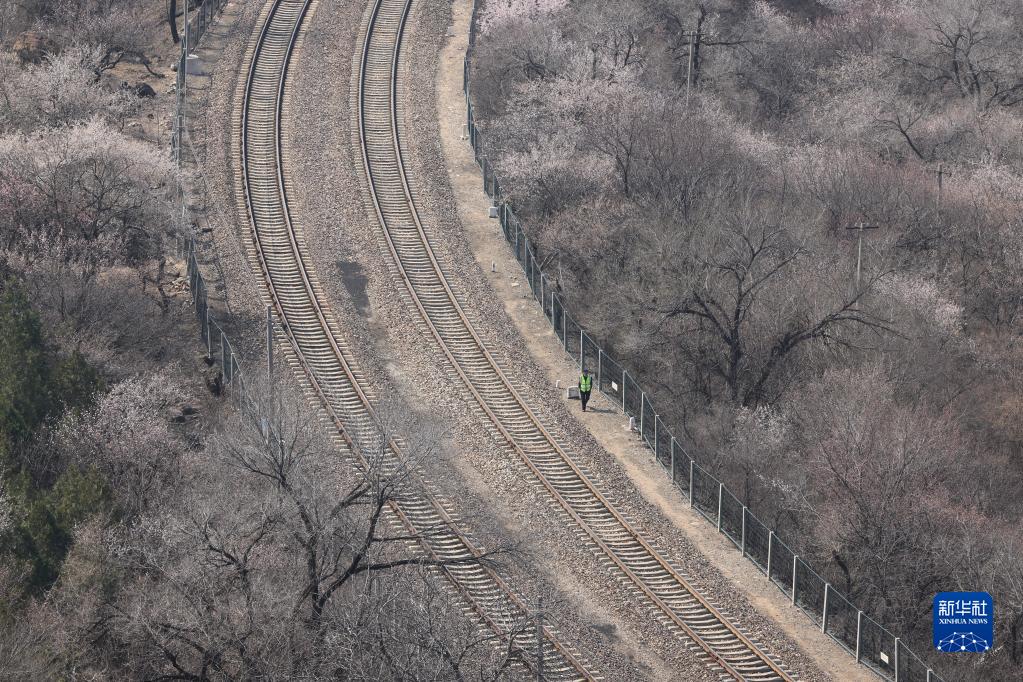 4月4日,北京鐵路公安處南口站派出所的民警在居庸關(guān)長(cháng)城附近線(xiàn)路進(jìn)行安全隱患排查工作。