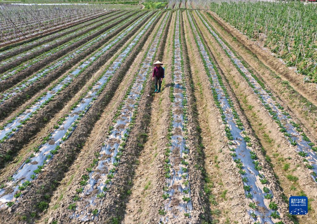 4月6日,村民在廣西南寧市興寧區五塘鎮的田間管護作物(無(wú)人機照片)。