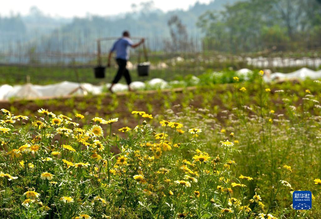 4月10日,四川省廣安市廣安區大龍鎮果壩村村民在蔬菜基地勞作。