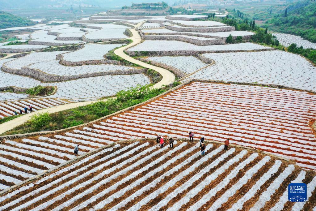 4月10日,在貴州省黔南布依族苗族自治州福泉市陸坪鎮羅坳村,村民在田間勞作(無(wú)人機照片)。
