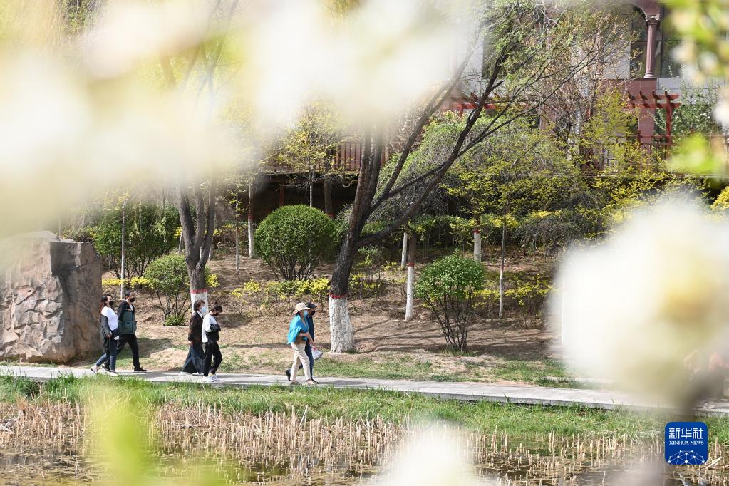 4月24日,在西寧市城西區白沙灘公園內,市民在公園內散步。