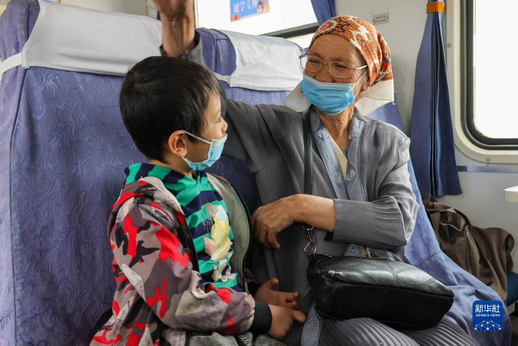 在開(kāi)往和田方向的“和田玉龍號”列車(chē)上,老人和孩子聊天(4月27日攝)。