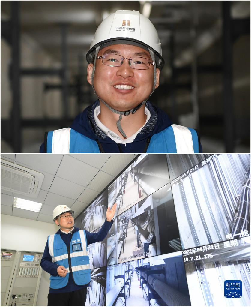 拼版照片:上圖為中國雄安集團基礎建設公司業(yè)務(wù)經(jīng)理張偉元(4月21日攝);下圖為張偉元在雄安容東地下管廊監控室工作(4月21日攝)。