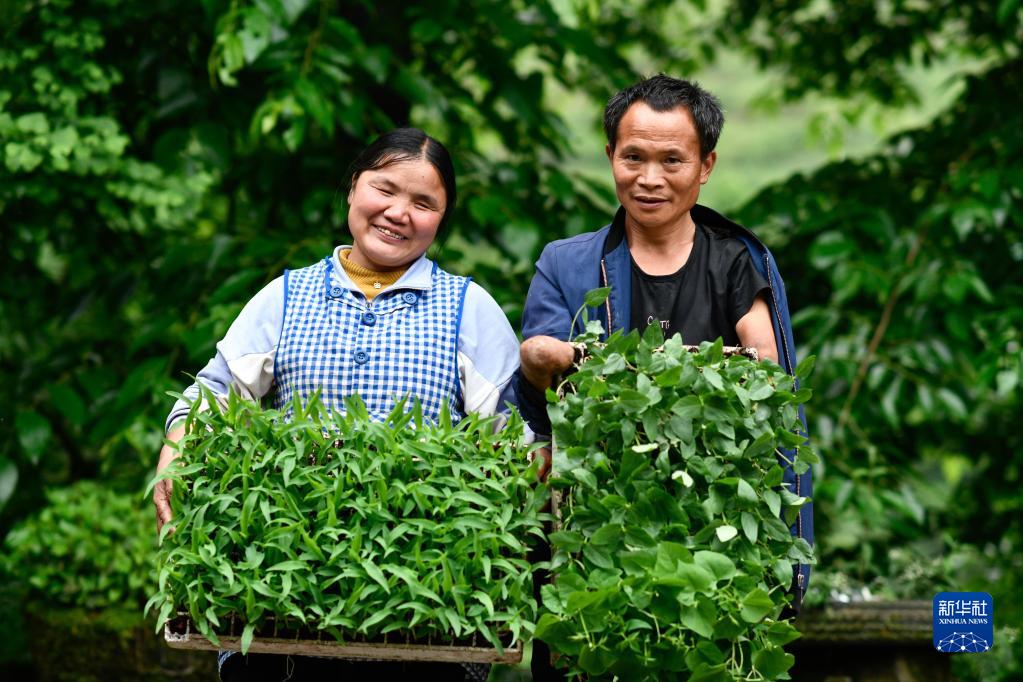 趙友良與妻子簡(jiǎn)琴展示他們今年培育的玉米苗和豇豆苗(5月12日攝)。
