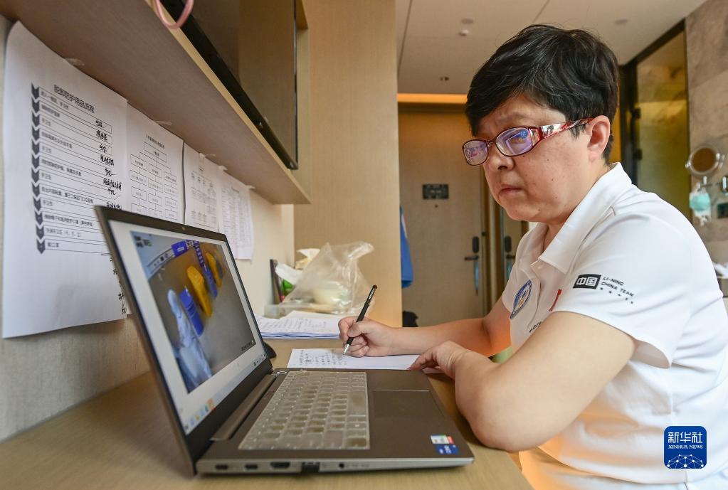回到住地房間后,胡鷹鷹在電腦上回看監控記錄并整理院感控制動(dòng)態(tài)報告(5月13日攝)。